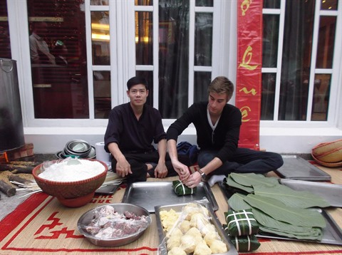 | Un touriste étranger participe à la conception des "bánh chưng" au marché du Têt 2017 à l’hôtel Sofitel Métropole de Hanoï. |
