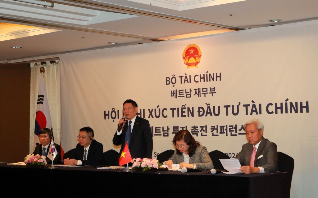 | Le ministre des Finances, Hô Duc Phoc (debout), préside la conférence de promotion des investissements financiers à Séoul. |