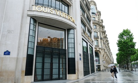 | Des gens passent devant un magasin Louis Vuitton à Paris en mai 2020. |