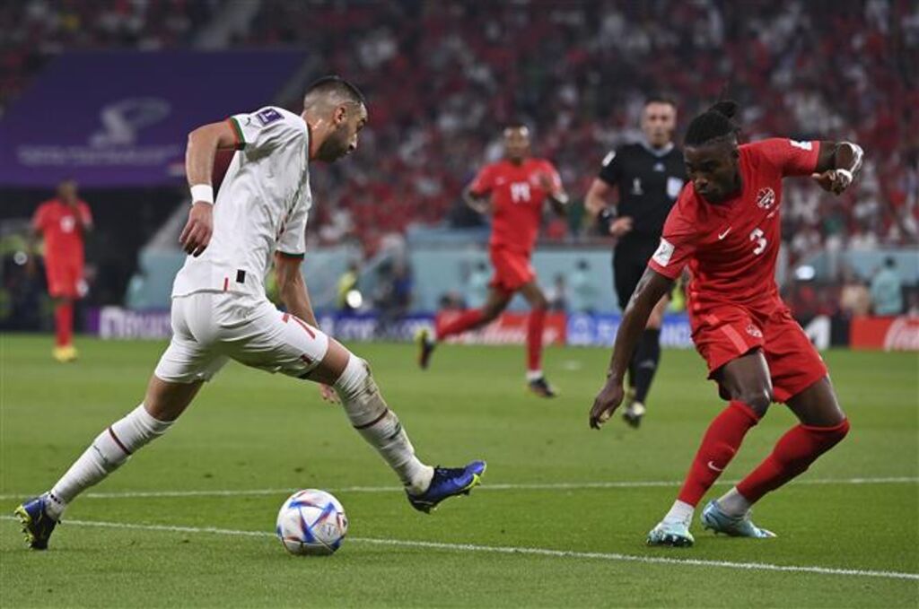 | Le Marocain Hakim Ziyech (gauche) lors d'un dispute de ballon du match contre le Canada, le 1er décembre à Doha. |