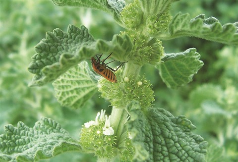 Il donne des petites fleurs blanches bilabiées disposées en verticilles à l’aisselle des feuilles supérieures.