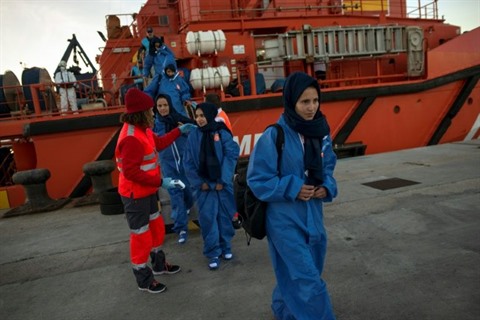 | Des migrantes transferrées d'un bateau des gardes-côtes espagnols à leur arrivée dans le port d'Algésiras en Espagne, le 27 novembre. |