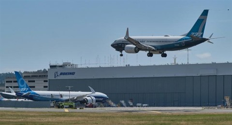 | Un Boeing 737 MAX en phase d'atterrissage après avoir effectué le premier d'une série de vols de certification, le 29 juin à Seattle |