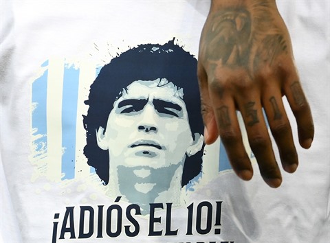 | Le portrait de l'Argentin Diego Maradona, décédé le 25 novembre, est affiché sur un T-shirt, porté par un joueur du Paris Saint-Germain, le 28 novembre au Parc des Princes. |