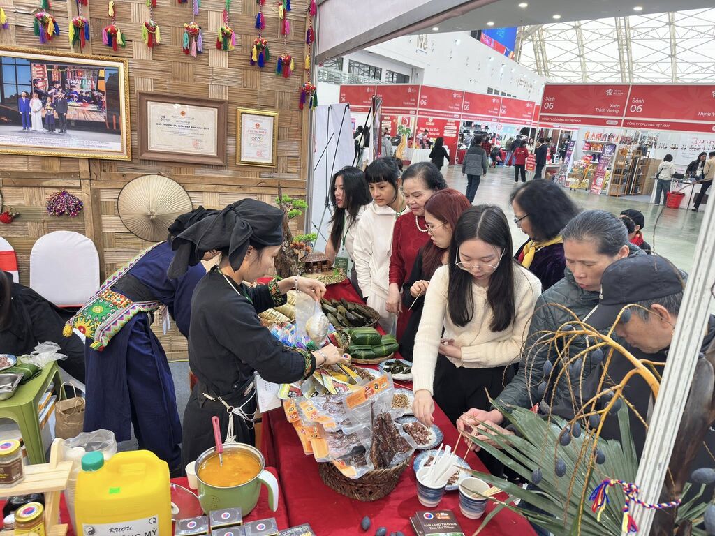 Sans décibels ni promotions criardes, ce pavillon en bambou, orné de cloisons imitant les maisons sur pilotis, déploie des brocatelles multicolores et des chapeaux coniques. Il raconte l’artisanat Tày avec une simplicité désarmante, tranchant sur les néons modernes des stands voisins. Les femmes en tenue Tày - Nùng, sourire radieux, tendent des bouchées : "Goûtez !" Une simple dégustation se transforme en une leçon vivante - vie au village, rites ancestraux, transmission culturelle.