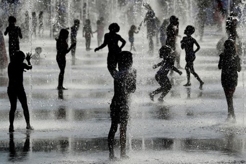 | Des enfants jouent dans une fontaine à Nice, le 26 juin. |
