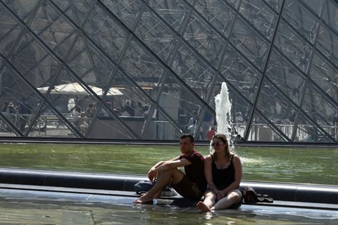 | Des touristes se rafraîchissent dans un bassin devant la Pyramide du Louvre, le 26 juin. |