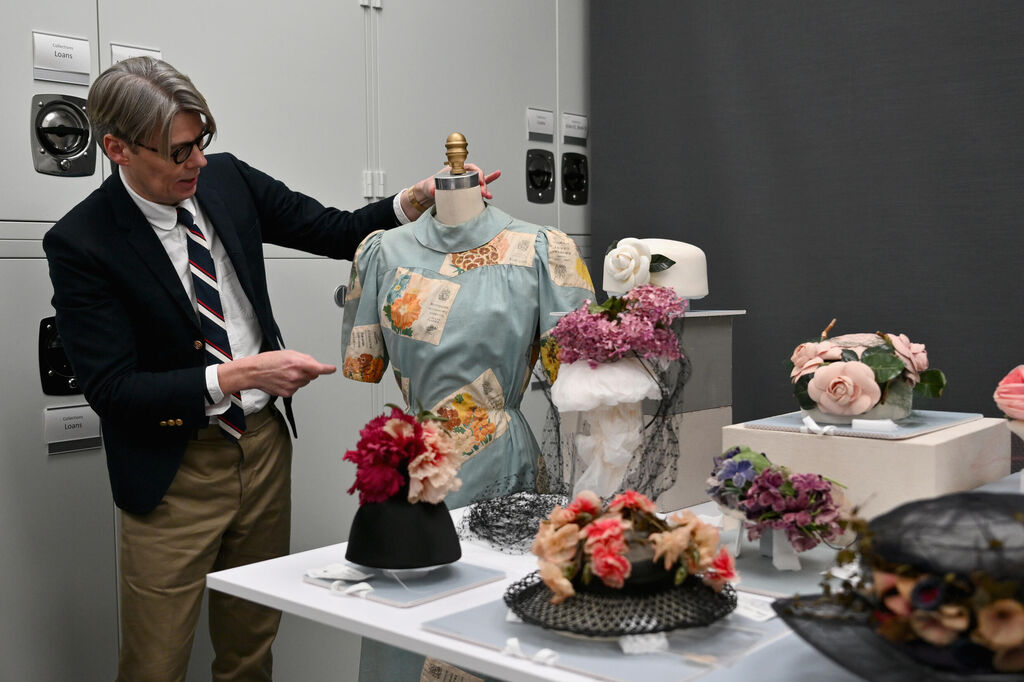 | Le conservateur du département mode du Met Museum, Andrew Bolton, montre, le 8 novembre, une robe Schiaparelli de 1939-1941. |