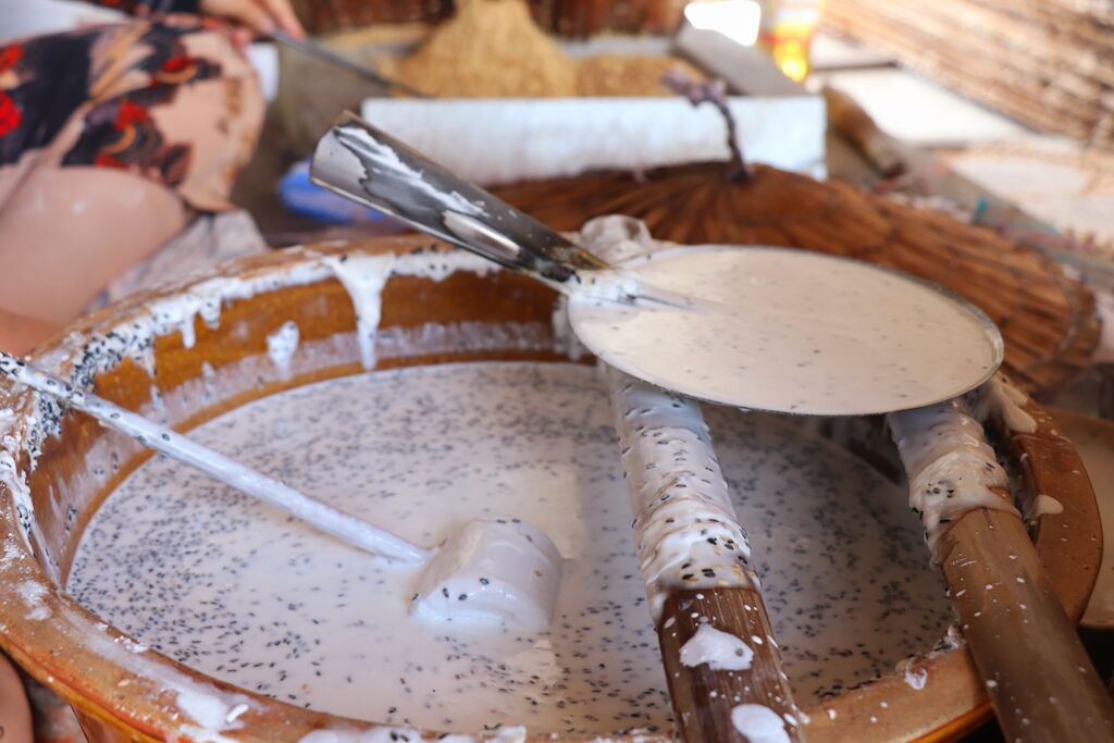 Faire cuire les galettes de riz est une étape qui demande l’habileté des artisans. La quantité de pâte pour une galette équivaut à une petite louche. La pâte est étalée sur un torchon (roulé sur une marmite), après environ 20-25 secondes, la galette est cuite.