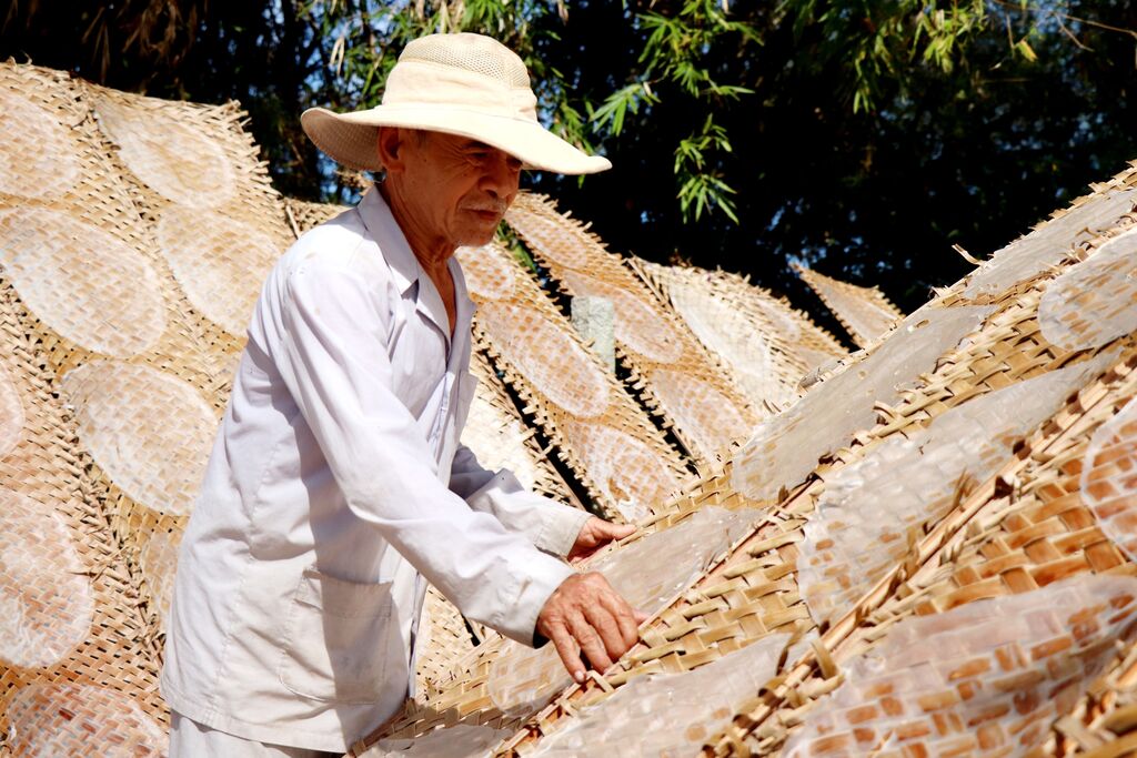 Après que les galettes de riz sont bien cuites, les artisans doivent les sécher. Par temps ensoleillé, le séchage ne dure pas longtemps.
