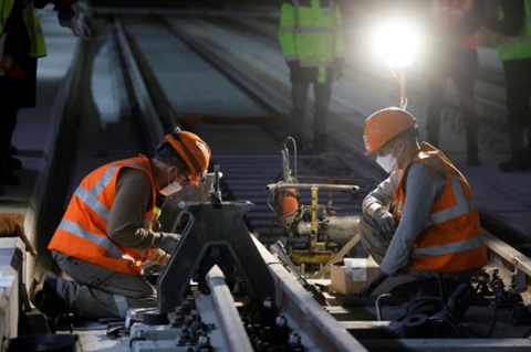 | Des ouvriers installent des rails des futures lignes de métro du Grand Paris, le 29 octobre 2020. |