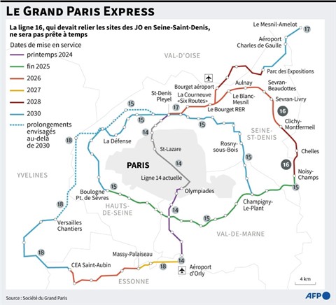 L’amorce de la ligne 17, qui devait mener jusqu'à l'aéroport du Bourget, où un quartier doit être construit pour loger les médias du monde entier, subit le même sort: elle ne sera pas prête avant le second semestre 2026.