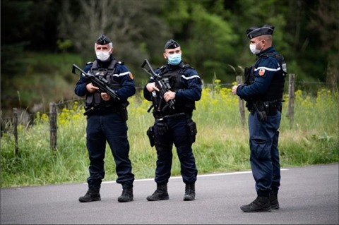 | Des gendarmes engagés dans l'opération de recherche du double meurtrier des Cévennes, le 13 mai 2021 à Saumane. |