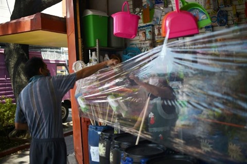 | Une échoppe protégée sommairement avec du plastique contre le COVID-19, le 5 mai à Mexico. |