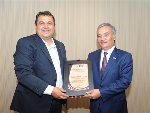| L'ambassadeur vietnamien au Mexique, Nguyên Hoài Duong (droite), et Antonio Guzmán Fernández, le président de l'Université autonome de Zacatecas. |