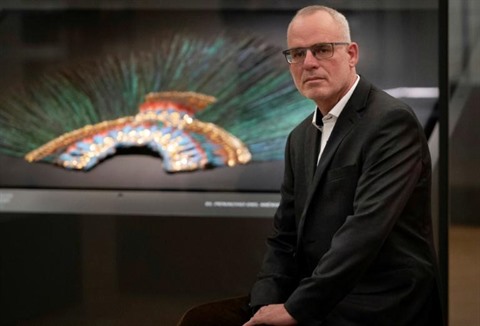 | Le commissaire Gerard van Bussel devant le "penacho", coiffure de cérémonie dont la légende veut qu'elle ait été portée par l'empereur aztèque Moctezuma, exposée au Musée d'ethnologie à Vienne, le 15 octobre. |