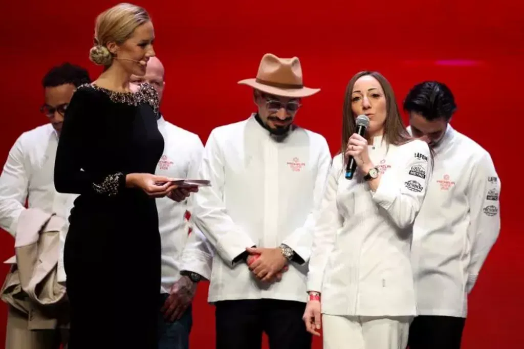 | La cheffe française Coline Faulquier (2e à droite) prend la parole après avoir reçu une étoile lors de la cérémonie de remise des prix du Guide Michelin à Monaco, le 16 mars. |