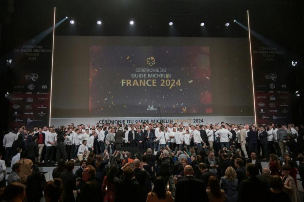 | Des chefs célèbrent leurs étoiles Michelin sur scène lors de la cérémonie de remise des prix du Guide Michelin France 2024 à Tours, le 18 mars. |