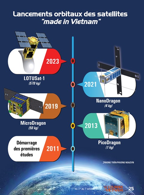 Le Vietnam a jusqu’à présent placé cinq satellites dans l’espace, à savoir Vinasat-1 en 2008, Vinasat-2 en 2012, VNREDSat-1 et PicoDragon en 2013, et MicroDragon en 2019. Il se concentre actuellement dans la formation de son personnel. Plusieurs groupes d’ingénieurs sont ainsi envoyés en formation dans de prestigieux centres d’aérospatiale à travers le monde. Dernier point : des infrastructures modernes seront construites et perfectionnées au service de la mise en orbite des prochains satellites.