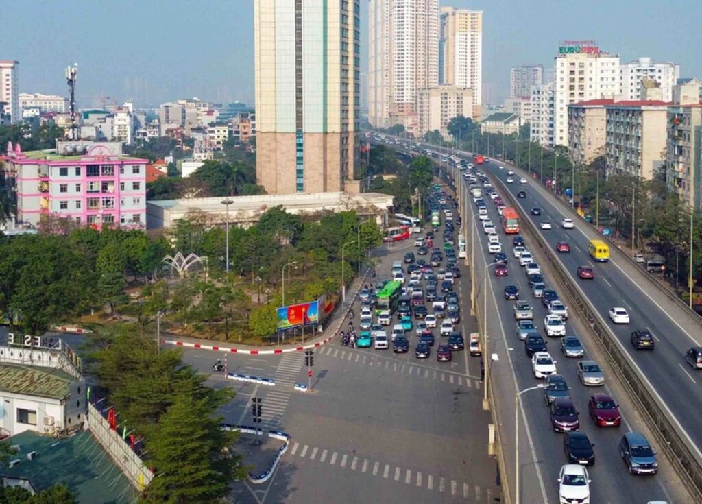 | Des files de voitures sur la route pendant le Têt du Serpent 2025, à Hanoi. |