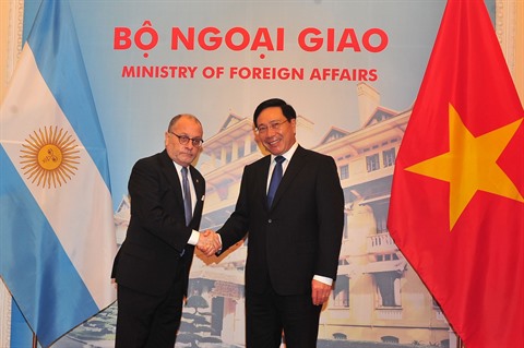 | Le ministre argentin des AE et du Culte, Jorge Faurie (gauche), reçu par le vice-Premier ministre et ministre vietnamien de AE, Pham Binh Minh, le 30 juillet. |