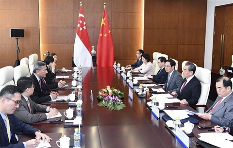 | Le conseiller d'État chinois et ministre des Affaires étrangères Wang Yi (2e, droite) et son homologue singapourien Vivian Balakrishnan (3e, gauche). |