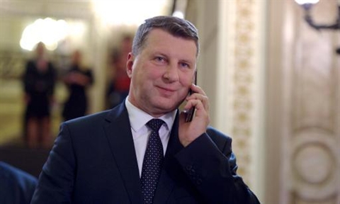 | Le nouveau président letton, Raimonds Vejonis, au téléphone après son élection le 3 juin à Riga |