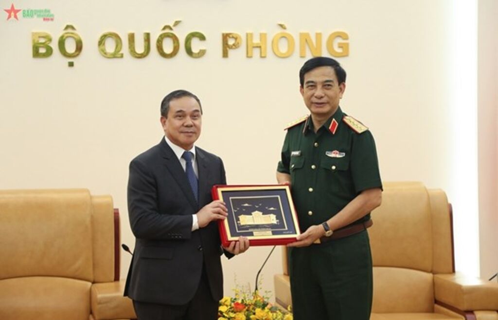 | Le général Phan Van Giang (droite) remet un cadeau de souvenir à l'ambassadeur du Laos, Sengphet Houngboungnuang. |