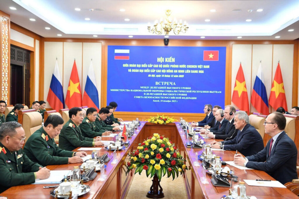 | Le général Phan Van Giang (droite), membre du Politburo, ministre de la Défense, et le secrétaire du Conseil de sécurité de la Fédération de Russie, Sergueï Choïgou, le 10 décembre. |