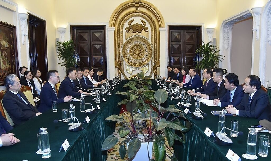 | Le ministre des Affaires étrangères (AE,) Bùi Thanh Son (droite), reçoit Liu Ning, secrétaire du Comité du Parti de la région autonome Zhuang du Guangxi. |