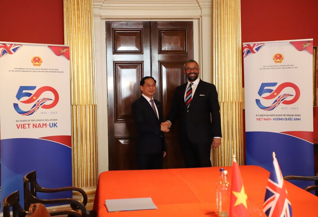 | Le ministre des Affaires étrangères Bùi Thanh Son (gauche) et le secrétaire d'État britannique aux Affaires étrangères James Cleverly lors d'un entretien tenu le 5 mai à Londres. |