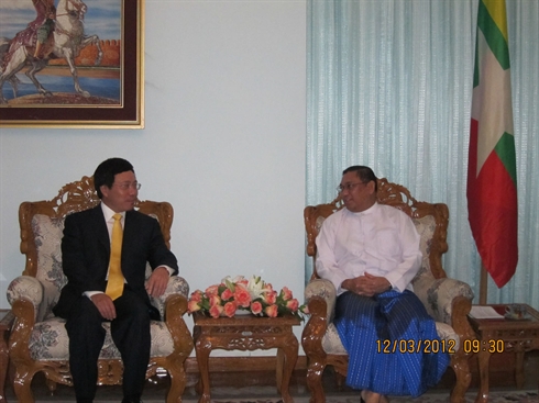 Lors de sa rencontre avec le président Thein Sein, le chef de la diplomatie vietnamienne a réaffirmé la politique immuable du Vietnam de renforcer son amitié traditionnelle et sa coopération avec le Myanmar. Le Vietnam se prépare d'ailleurs à la prochaine visite du président Thein Sein dans ce pays.