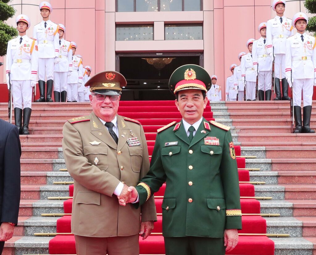 | Phan Van Giang, membre du Bureau politique, vice-secrétaire de la Commission militaire centrale et ministre vietnamien de la Défense (droite), et Álvaro López Miera, membre du Bureau politique et ministre des Forces armées révolutionnaires de Cuba. |