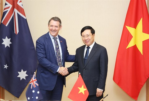 | Le ministre en chef du Territoire du Nord de l'Australie, Michael Gunner (gauche), et le vice-Premier ministre et ministre des Affaires étrangères Pham Binh Minh. |
