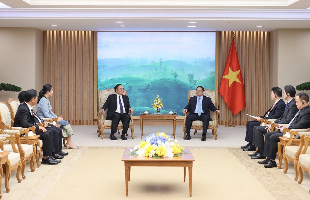 | Rencontre avec le ministre lao du Plan et de l'Investissement, Khamchen Vongphosy (gauche), et le Premier ministre Pham Minh Chinh. |