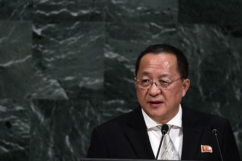 | Le ministre des Affaires étrangères de la RPDC, Ri Yong Ho au siège de l'ONU, le 23 septembre à New York. |