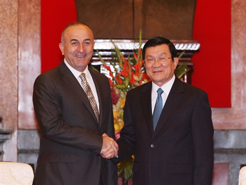 | Le président du Vietnam, Truong Tân Sang (droite), et le ministre turque des Affaires étrangères, Mevlut Cavusoglu, le 18 mars à Hanoi. |