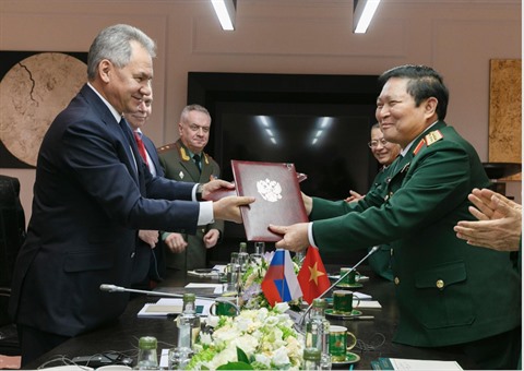 | Les deux ministres Ngô Xuân Lich (droite) et Sergei Shoigu échangent la feuille de route de coopération militaire bilatérale pour la période 2018-2020. |