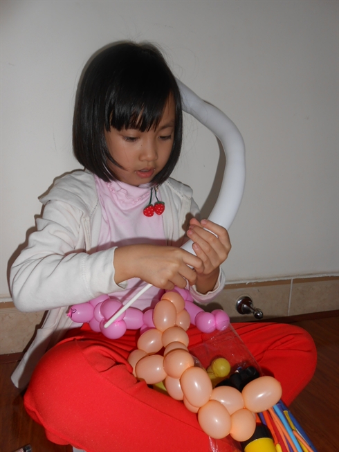 Aujourd’hui, le cours commence un peu plus tard, à la suite de la compétition entre les membres. Exposant des objets nécessaires pour le cours devant les apprenants, Vu Tri Cuong, responsables des cours, se lancent dans la pratique, après avoir présenté minutieusement les techniques de base comme la manière de gonfler les ballons, de nouer et de manipuler. «Il te faut savoir que ce sont des ballons assez difficiles à gonfler, parce que plus épais. Donc, inutile pour toi d’essayer de gonfler à la bouche !», remarque Tri Cuong à la petite fille de 8 ans, qui essaie de gonfler son ballon à la bouche. La petite fille, qui tient en main un bouquet de ballons, visiblement impatiente de se lancer dans la pratique.