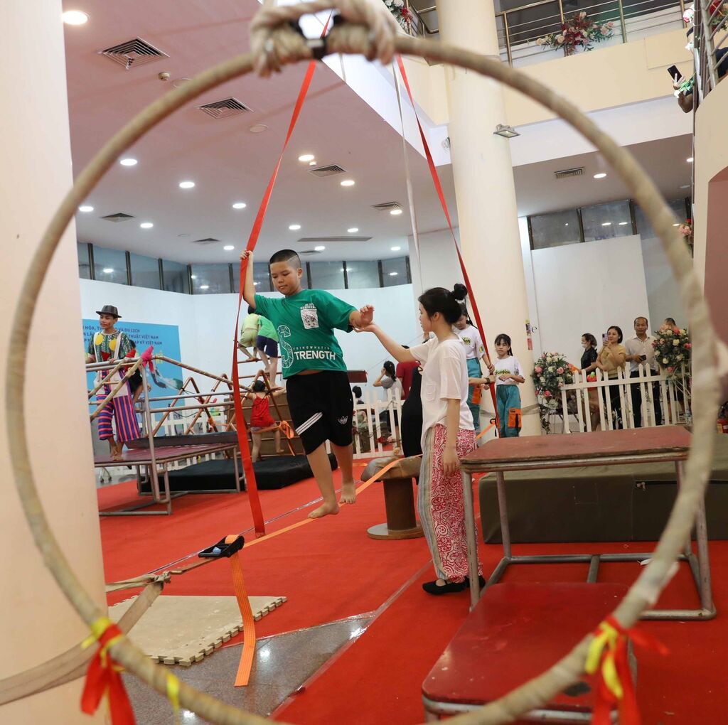 | Des enfants hanoïens faisant connaissance avec des artistes du cirque, une activité au début de cet été. |