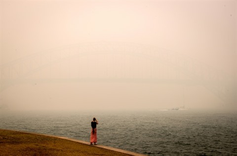 | La baie de Sydney recouverte d'un épais nuage provoqué par les fumées des feux de forêt. |