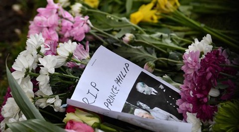 | Des fleurs et des messages de condoléance déposés devant le château de Windsor, ouest de Londres, le 11 avril, deux jours après la mort du Prince Philip, époux de la reine Elizabeth II. |