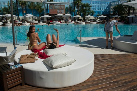 | Une employée désinfecte une banquette près de baigneuses dans une piscine à Séville, le 25 mai. |