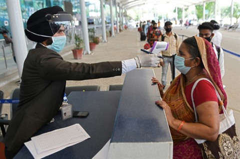 | Vérification de la température à l'aéroport international Sri Guru Ram Dass Jee à Amritsar dans le Nord de l'Inde, le 25 mai. |