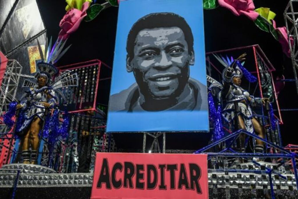 | L'école de samba Rosas de Ouro rend hommage à Pelé lors de son défilé du carnaval, le 18 février, à Sao Paulo. |