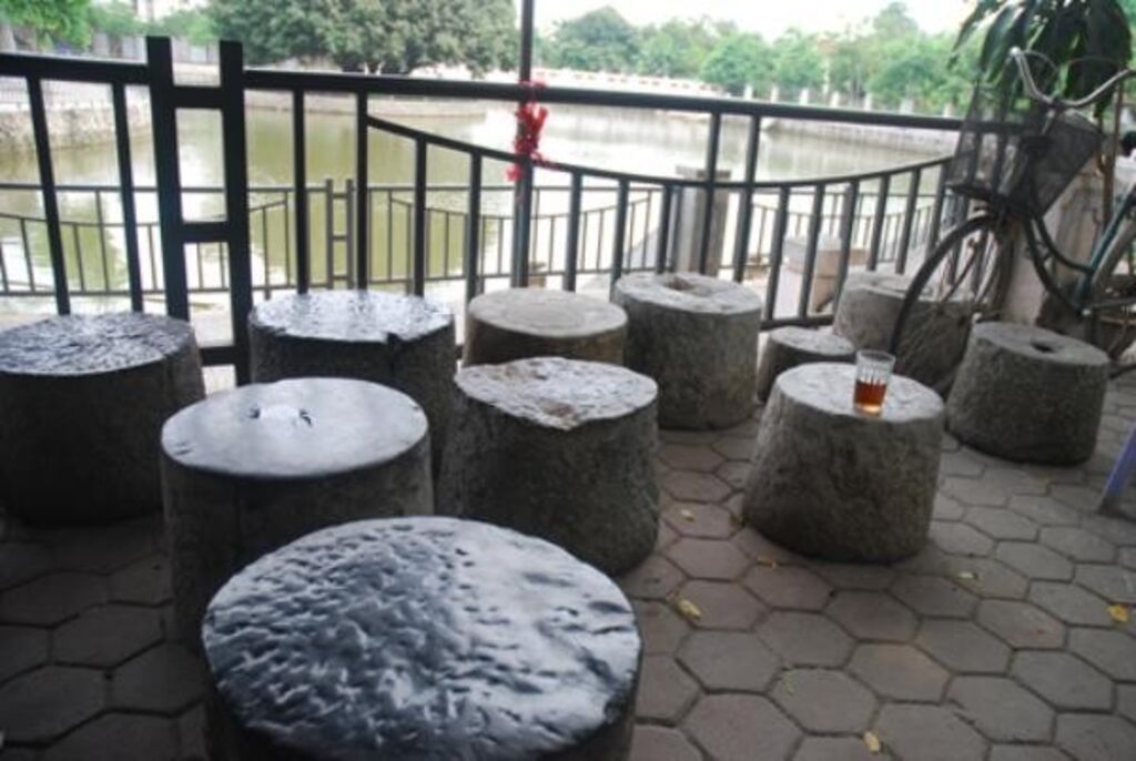 | Les moulins à riz en pierre verte se tansforment en chaises pour la gargote de thé de Mme Chinh. |