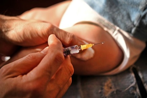 | Un médecin administre un vaccin à Quimper dans l'Ouest de la France, le 3 octobre 2017. |