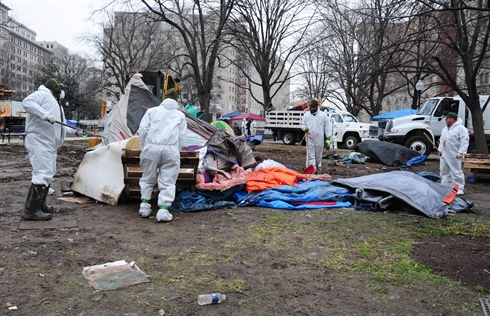 Après avoir quasiment démantelé le 4 février le campement du square McPherson occupé depuis le 1er octobre, la police a mené le 5 février la même opération sur Freedom Plaza. Il s'agissait dans les deux cas de vérifier que les campeurs respectaient le règlement du National Park Service qui gère les parcs de la capitale, et interdit le camping.