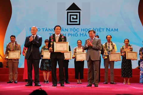 | Le directeur du Musée d’ethnographie du Vietnam, Vo Quang Trong (centre), lors de la cérémonie de remise du titre, le 8 juillet à Hanoï. |