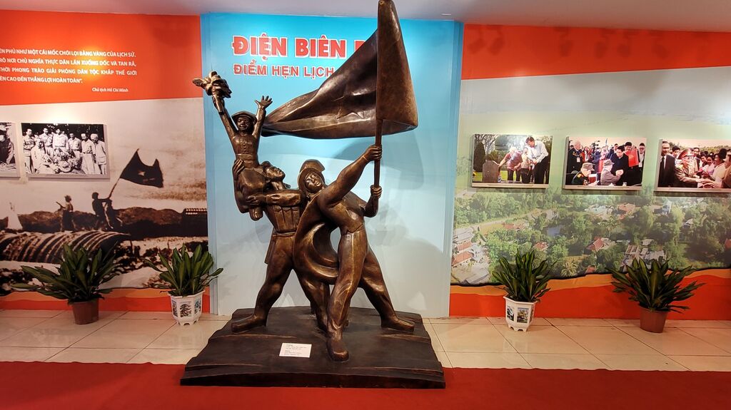 | La statue en bronze qui porte le nom "Victoire de Diên Biên Phu" du sculpteur Nguyên Hai trône à côté de l'entrée. |